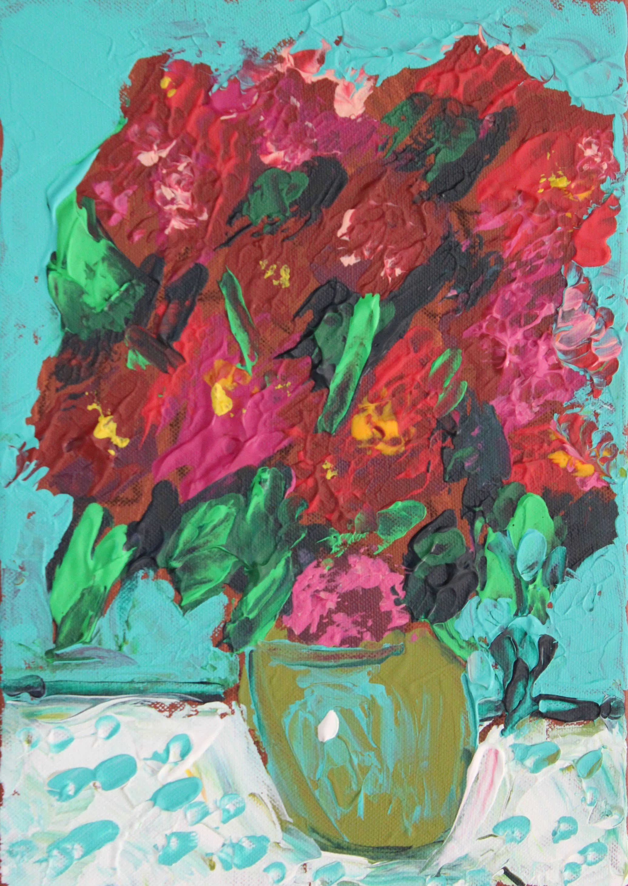 "Zinnien in olivgrüner Vase", Acryl auf Leinwand, gespachtelt, 35 x 25 cm, Oktober 2025 (B-1026)