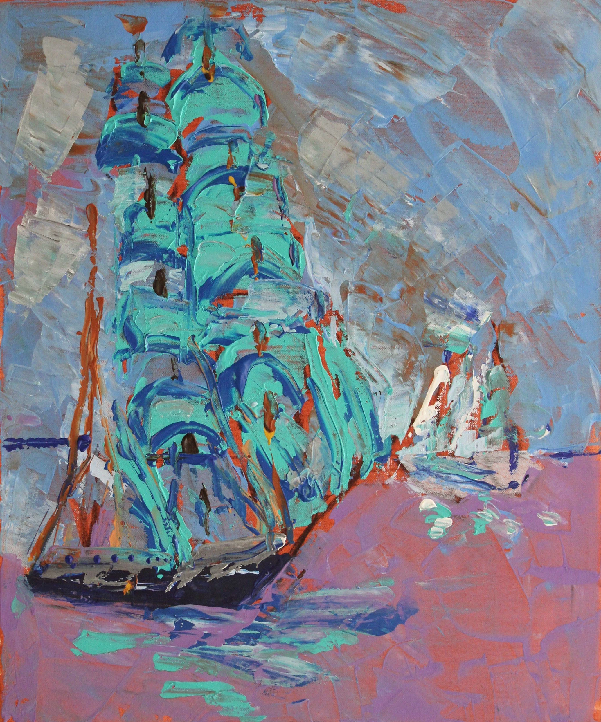 "Segelschiffe vor Bremerhaven, Deutschland", Acryl auf Leinwand, gespachtelt, 60 x 50 cm, September 2025 (L-994)