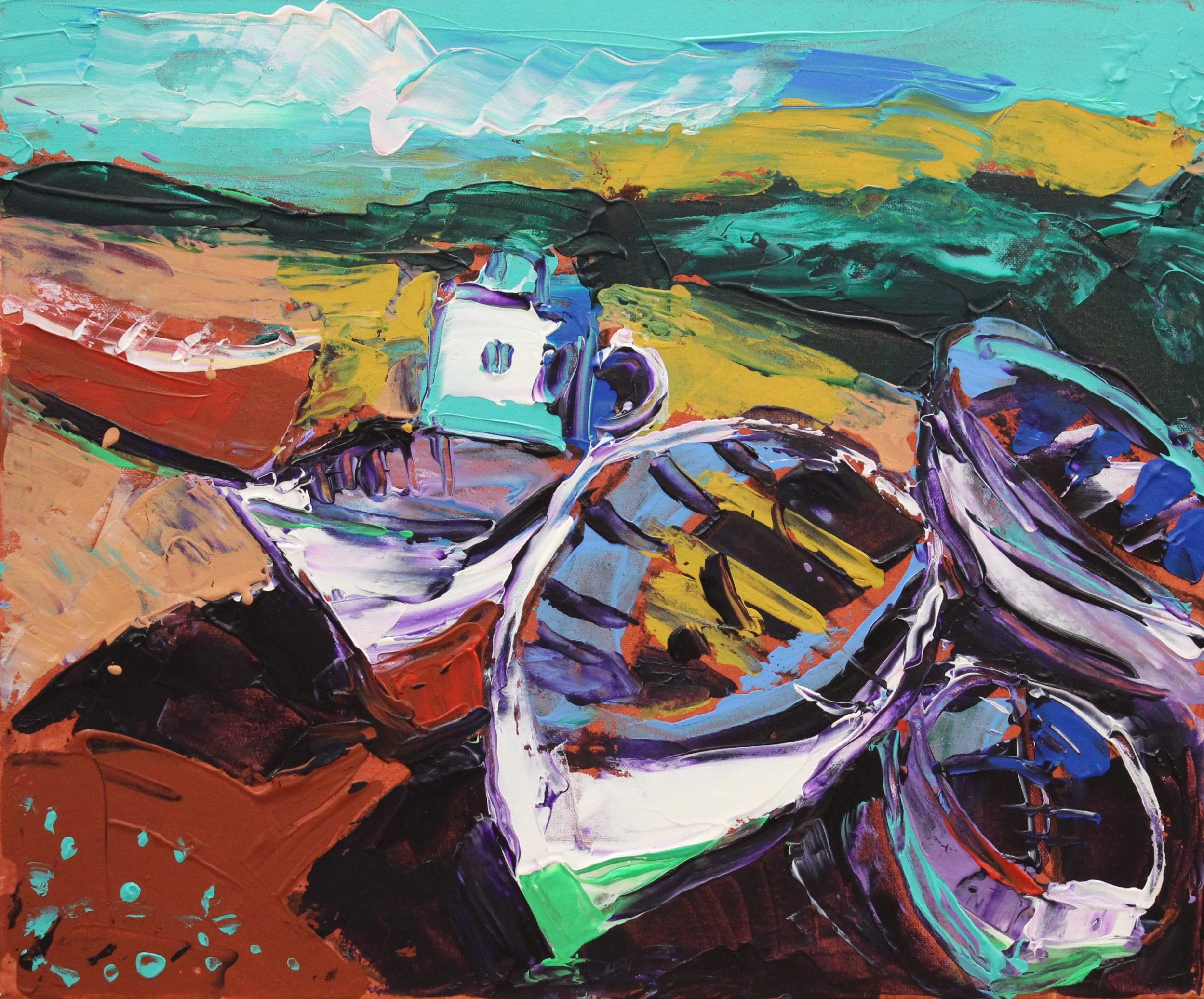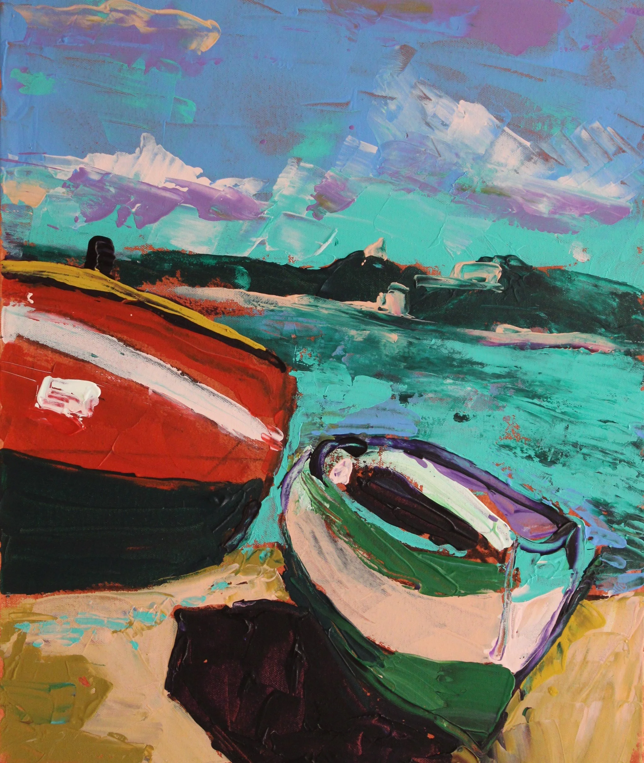 "Fischerboote am Strand von Knossos, Insel Kreta", Acryl auf Leinwand, gespachtelt, 60 x 50 cm, September 2025 (L-999)