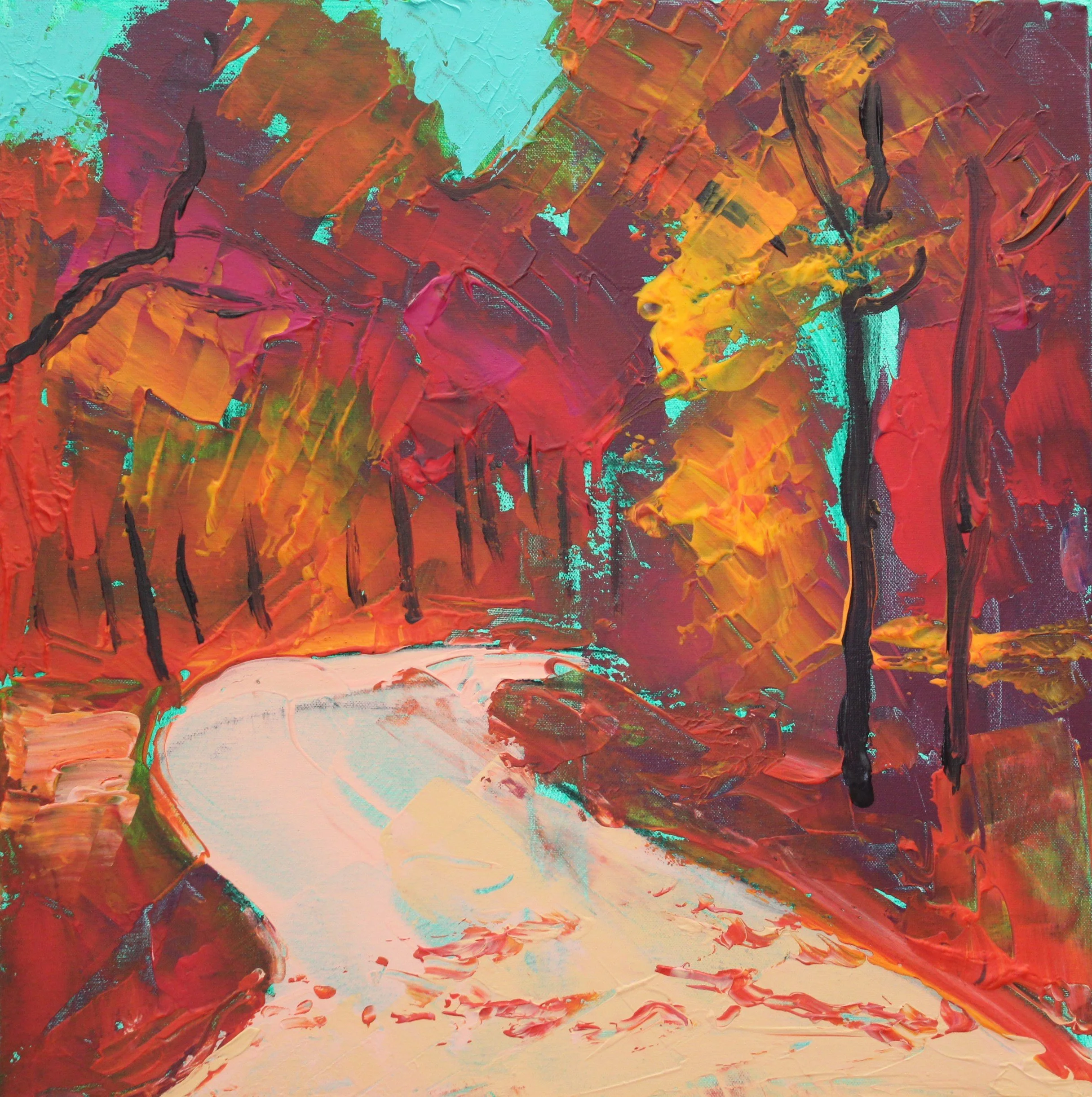 "Spazierweg unter herbstlichen Ahornbäumen, Japan", Acryl auf Leinwand, gespachtelt, 50 x 50 cm, September 2025 (L-997)