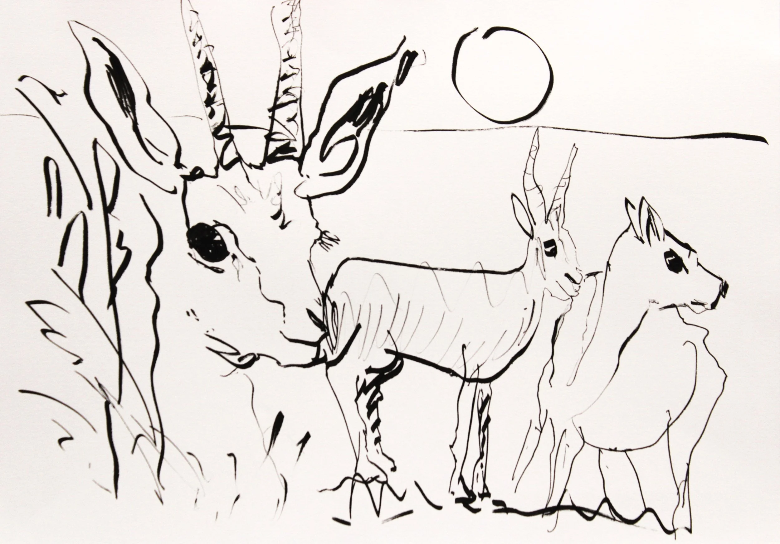 "Springböcke", Calligraphiestift auf Zeichenpapier, 29,7 x 42 cm, August 2025 (Z-Z-431)