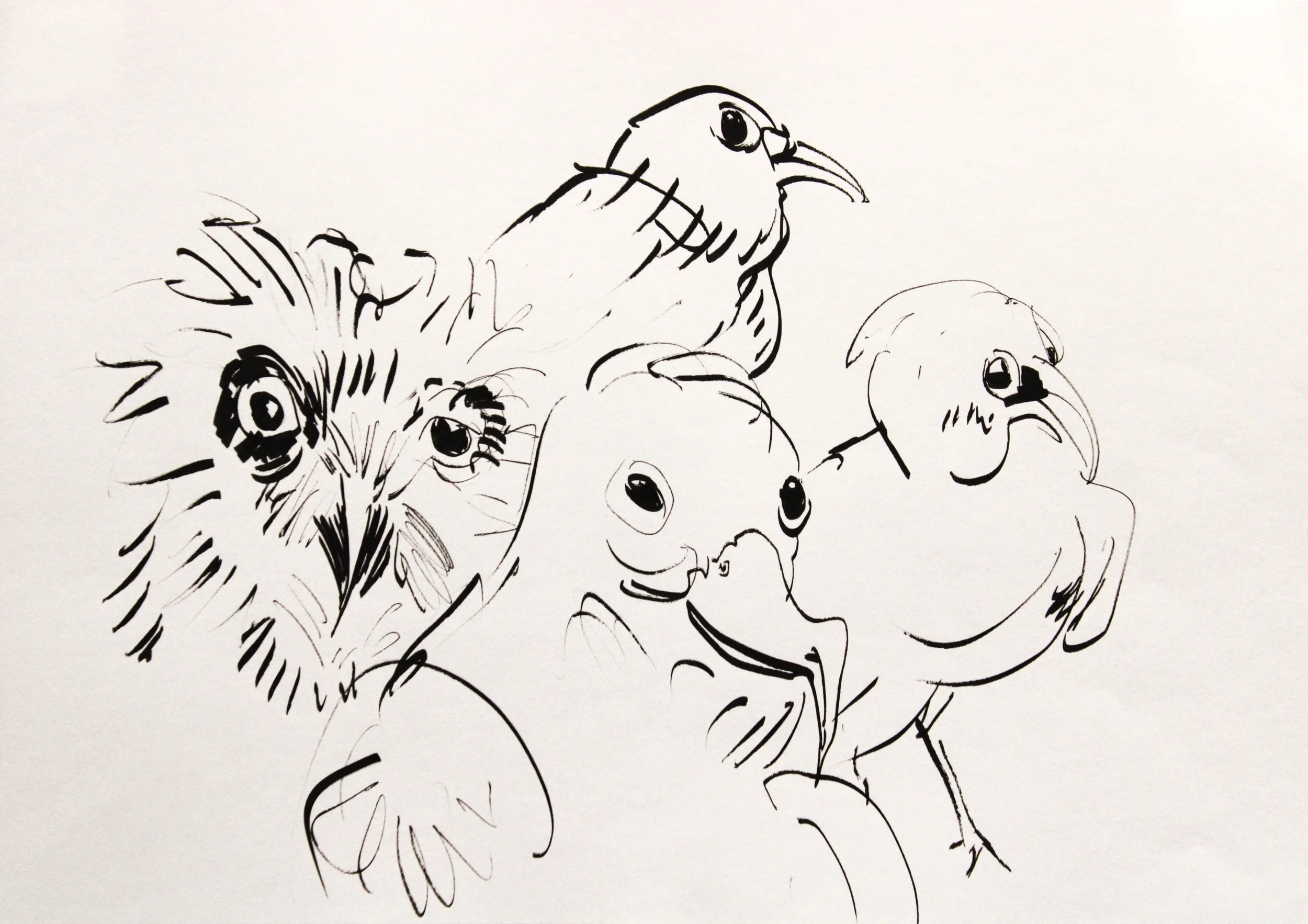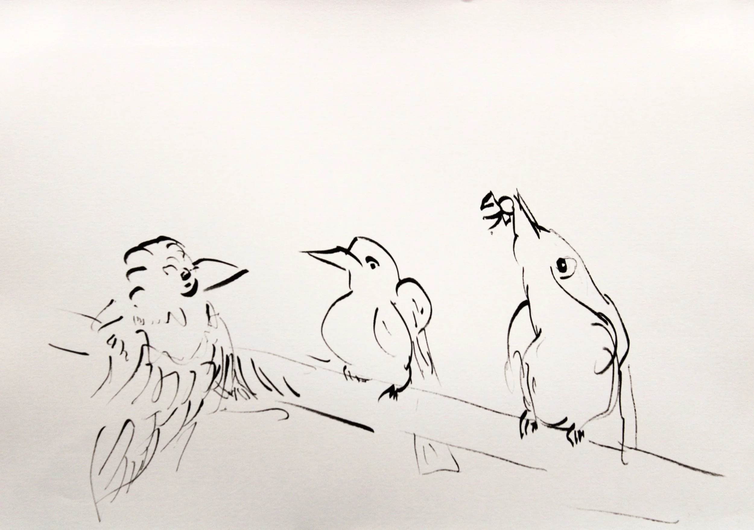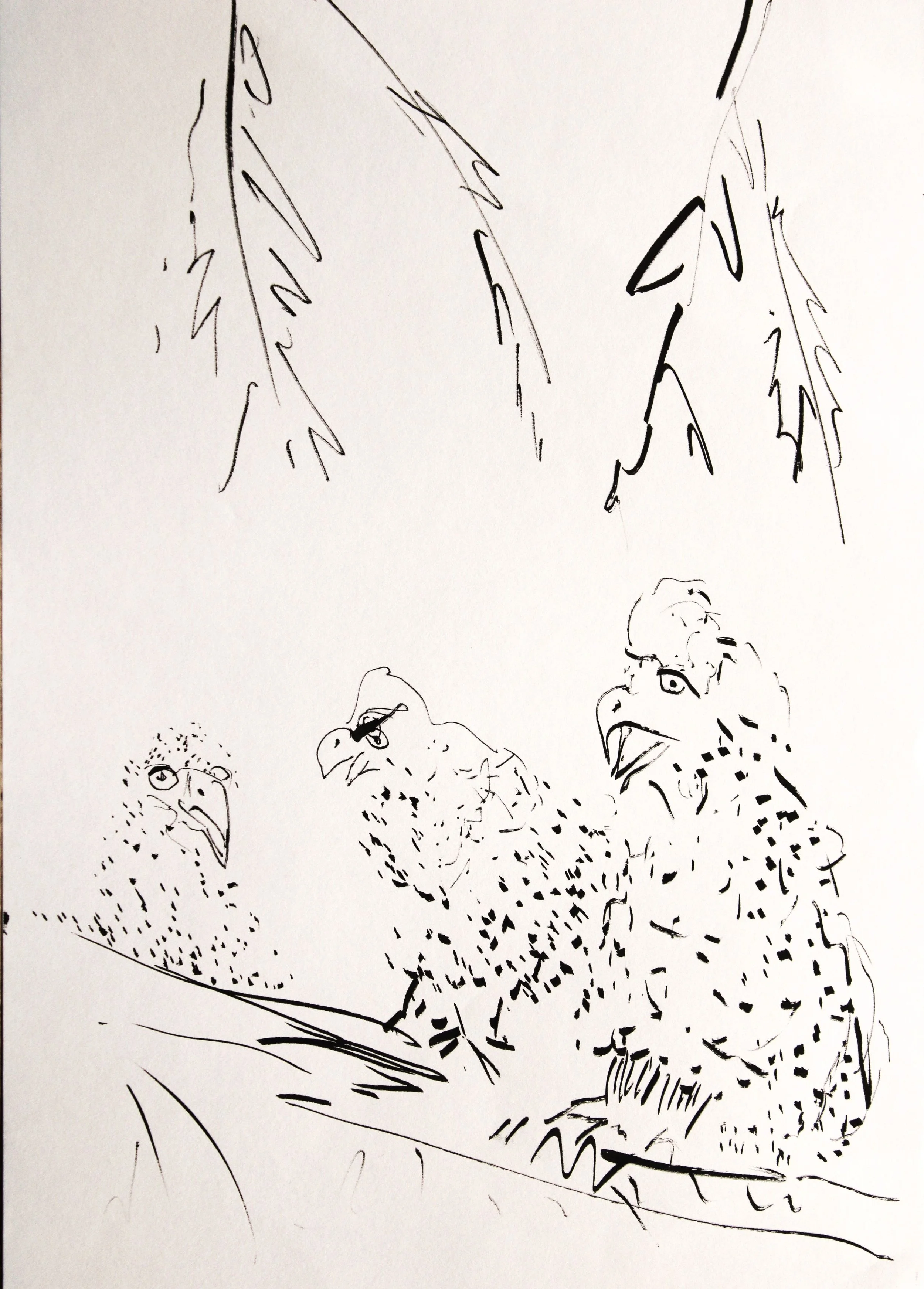 "Vogelnachwuchs", Calligraphiestift auf Zeichenpapier, 29,7 x 42 cm, August 2025 (Z-Z-418)