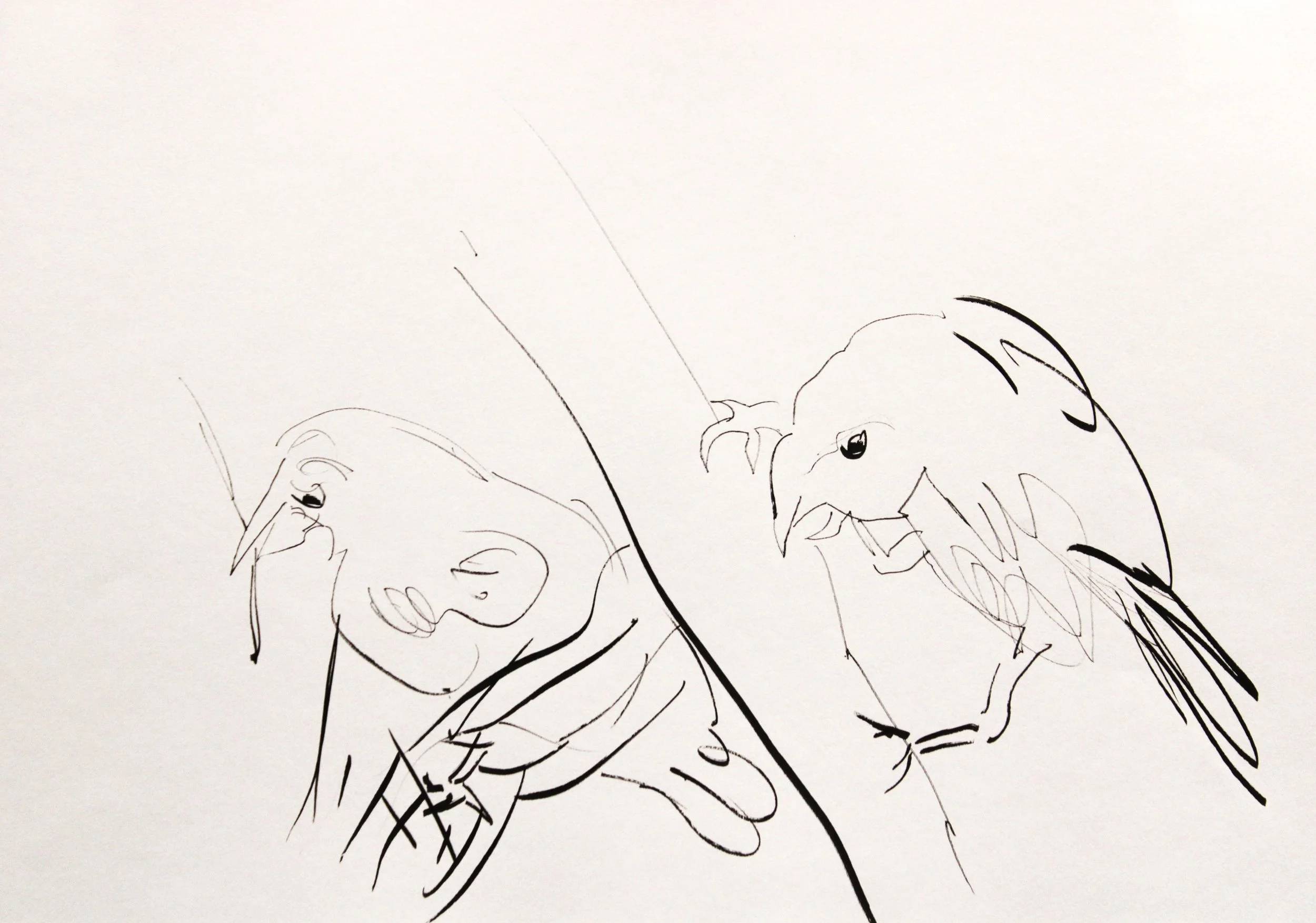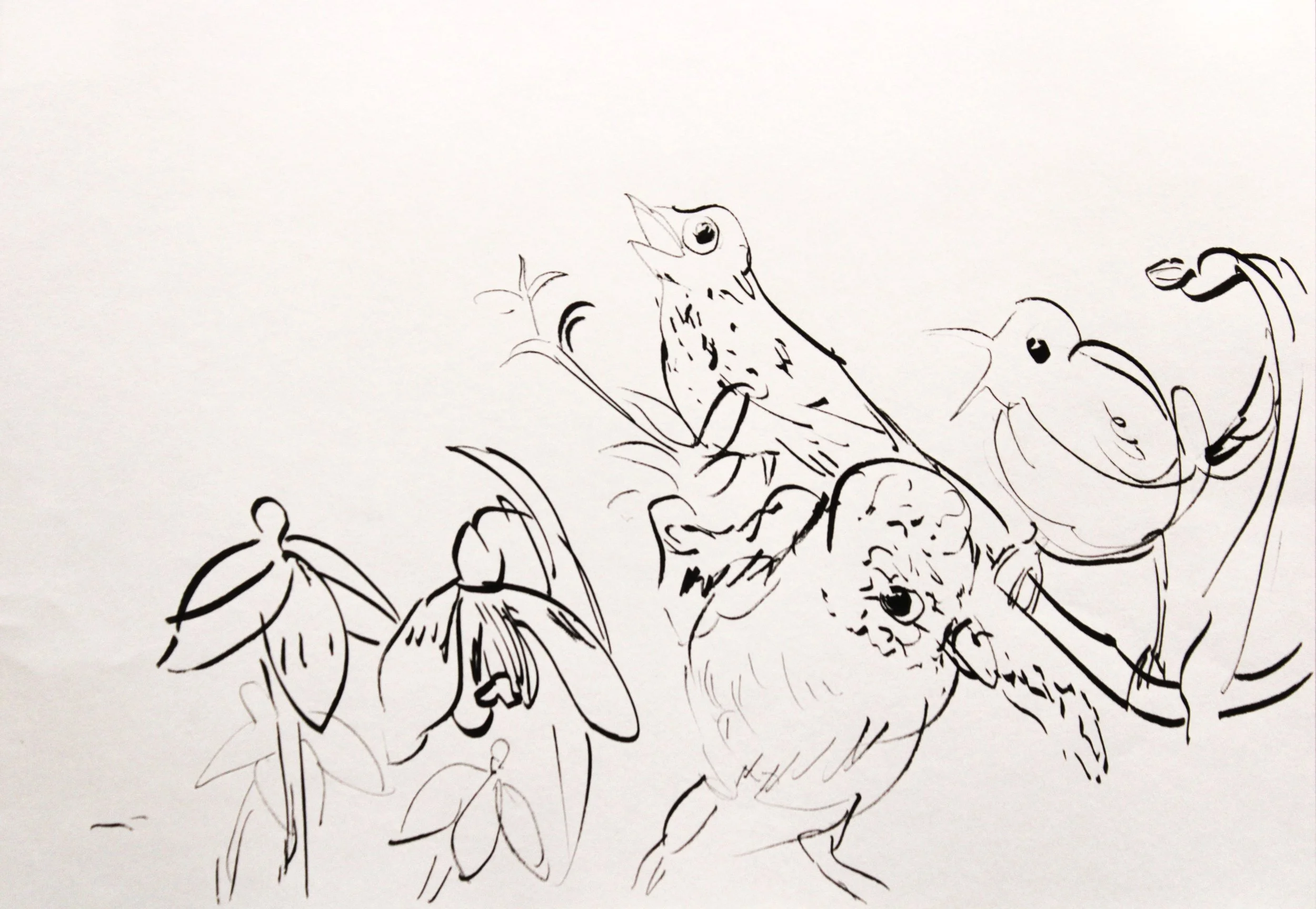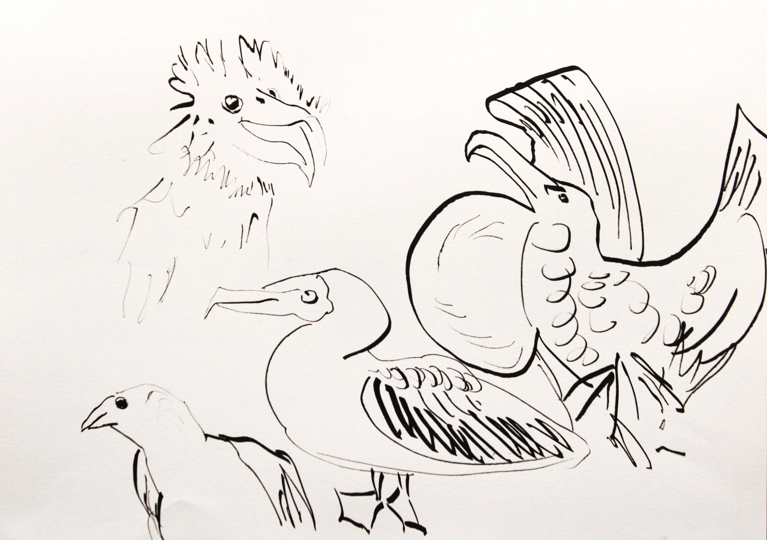 "Vogelnachwuchs", Calligraphiestift auf Zeichenpapier, 29,7 x 42 cm, August 2025 (Z-Z-418)
