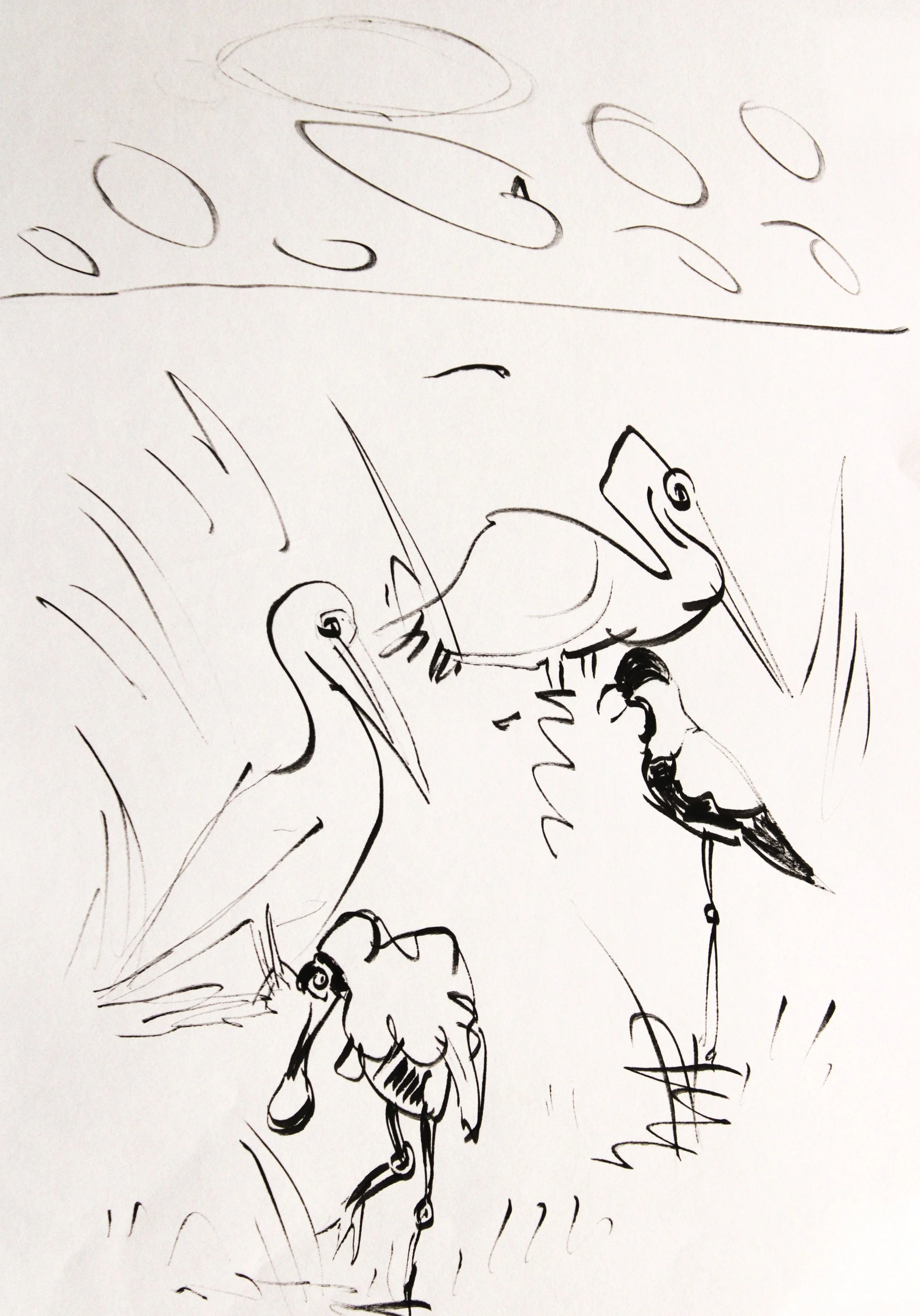 "Wasservögel", Calligraphiestift auf Zeichenpapier, 42 x 29,7 cm, September 2025 (Z-Z-392)